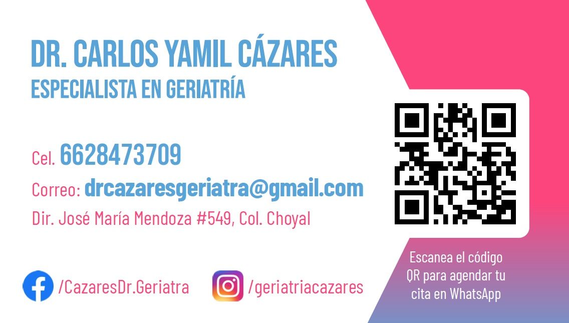 Soy el Doctor Carlos Yamil Cázares egresado de la Licenciatura de Medicina General de la Universidad de Sonora y egresado de la Especialidad de Geriatría por la Universidad de Guadalajara. Me encuentro Certificado por el Consejo Mexicano de Geriatría A.C.
